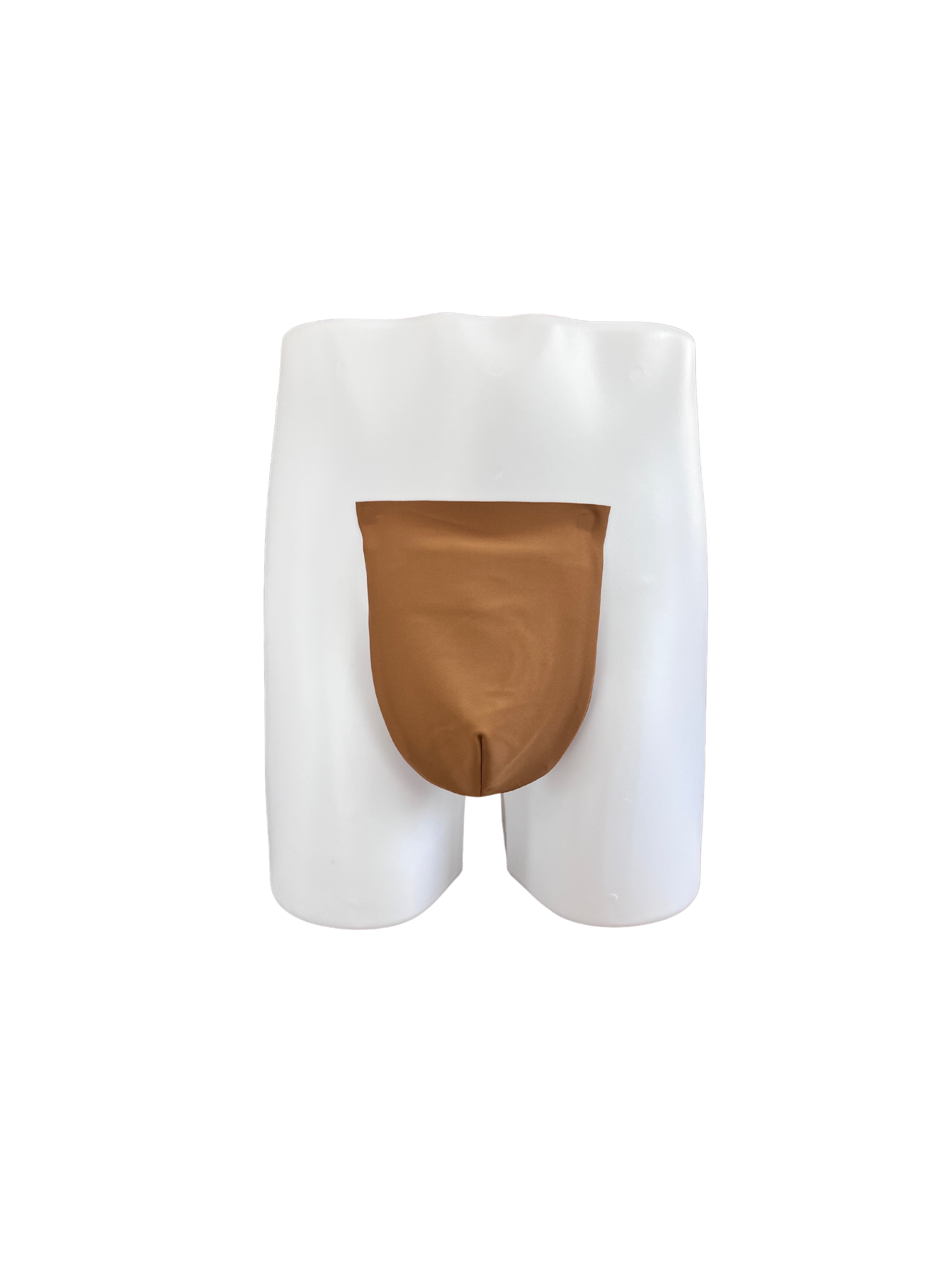 The Padded Pouch with Tail is stretchy and flexible, designed for ultimate comfort. It comes with a removable low-profile molded cup. There is a separate inside pocket for the barrier. It has an adjustable drawstring opening with a flat silicone toggle for securing in place. The tail is customizable as it can be shortened and/or slimmed down on the sides according to each individual body.